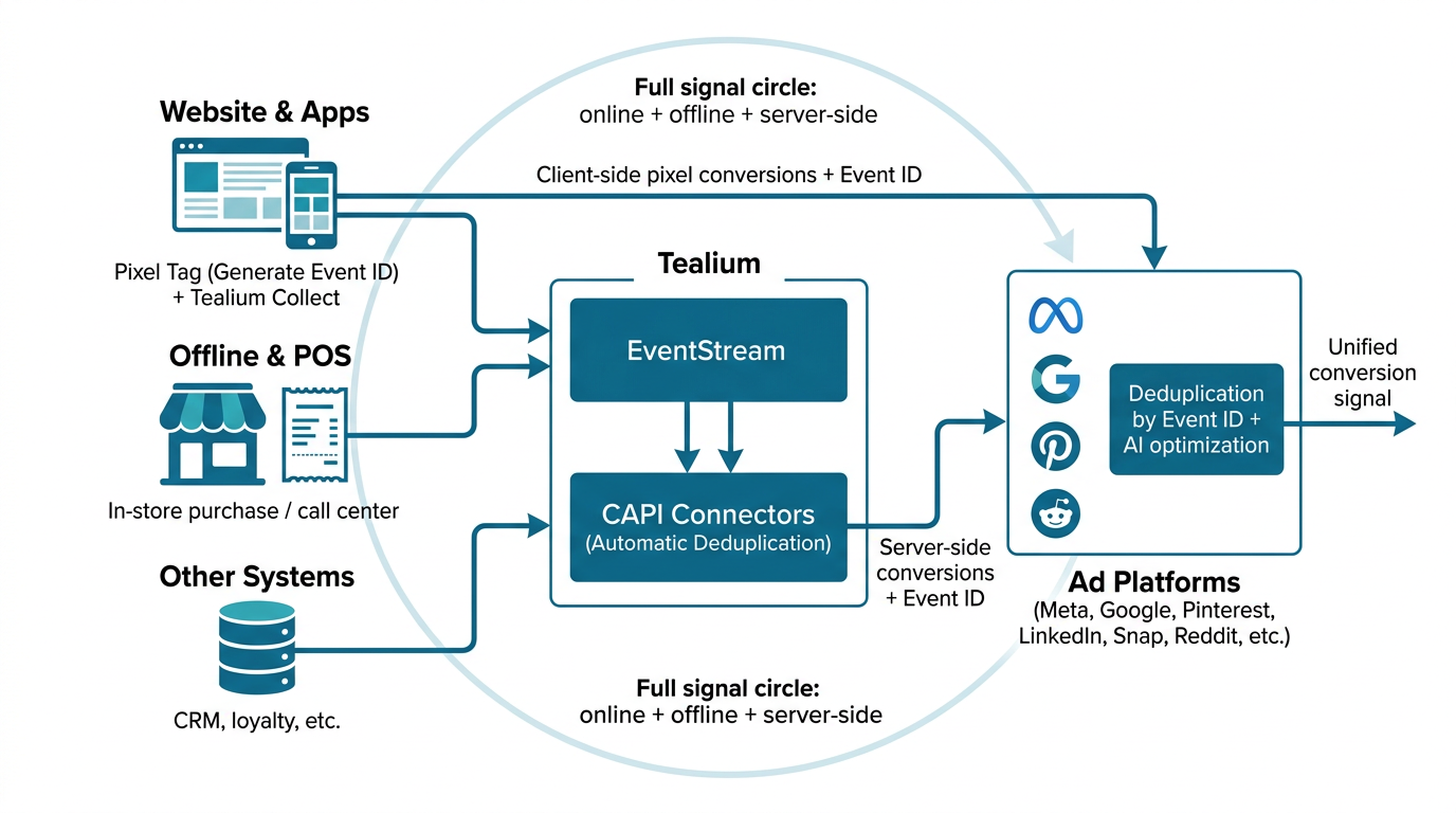 At Tealium, our conversion API solutions typically support a tag and connector with deduplication. We recommend a hybrid approach, where client-side tags and server-side conversion API connectors run together to: