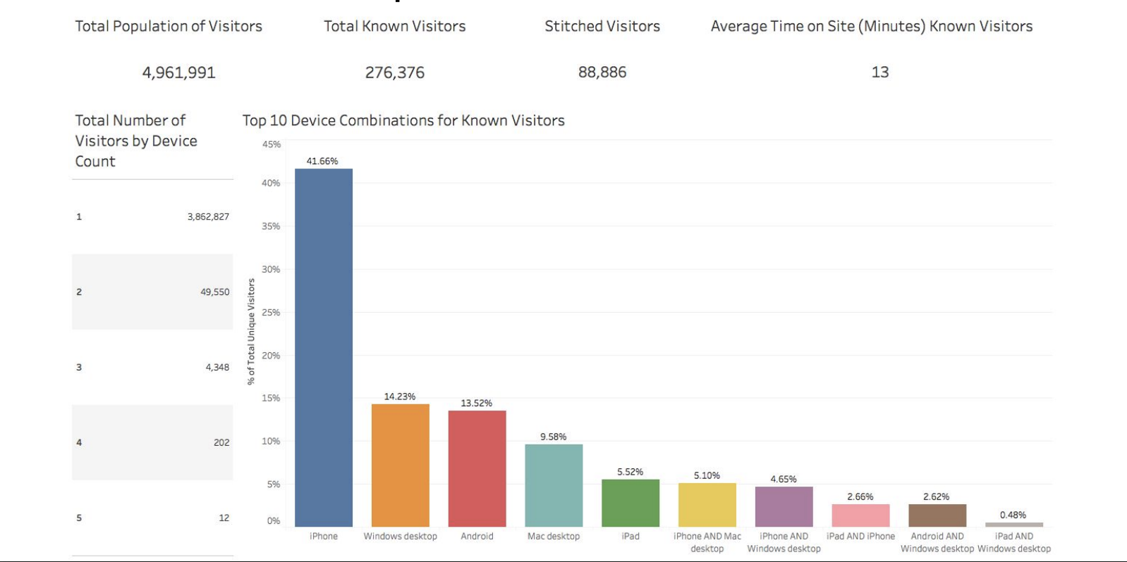 This query joins visitors_view_normalized with visitor_tallies_view_normalized to count the number of unique devices each visitor uses, then groups visitors by device count.