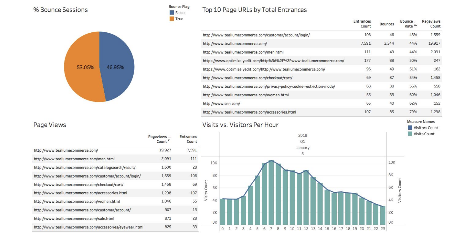 This query combines page view counts with bounce session counts to identify high-traffic pages with high bounce rates.